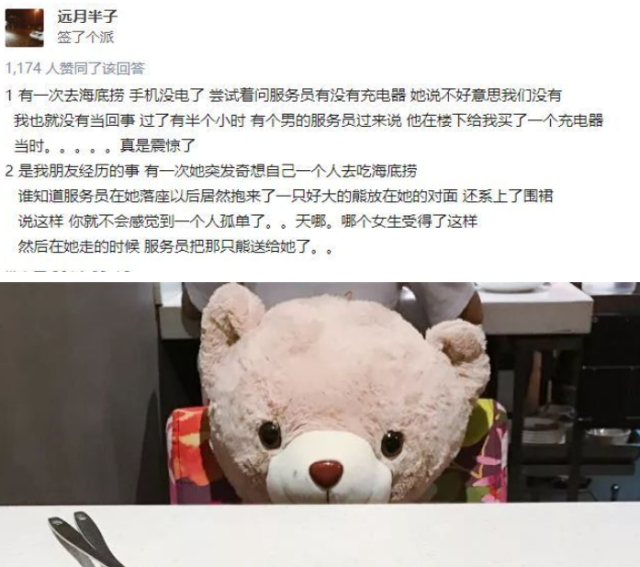 再加上海底捞的变态服务,也越来越让消费者不适应了,也可以说有些疲倦了。比如,过于殷切的服务,让消费者感觉到尴尬,比如当你一个人去的时候,店员会在你的对面放在大熊,会给消费者一种非常不自在的体验。